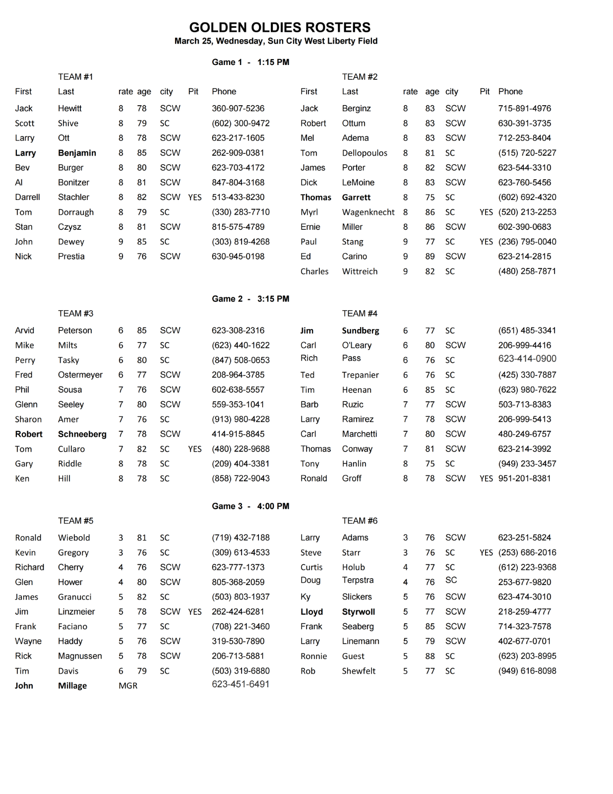 Golden Oldies Rosters